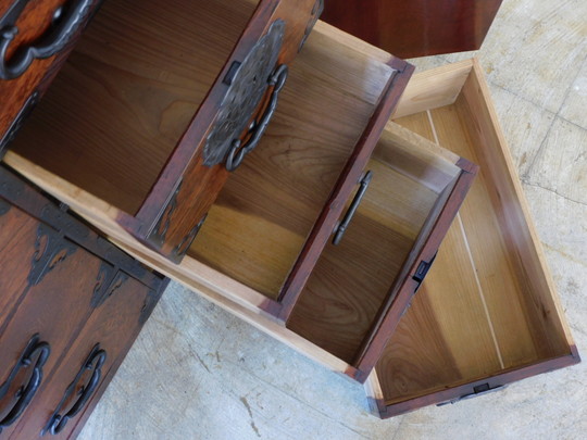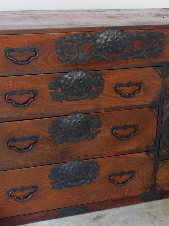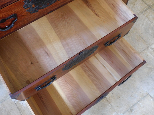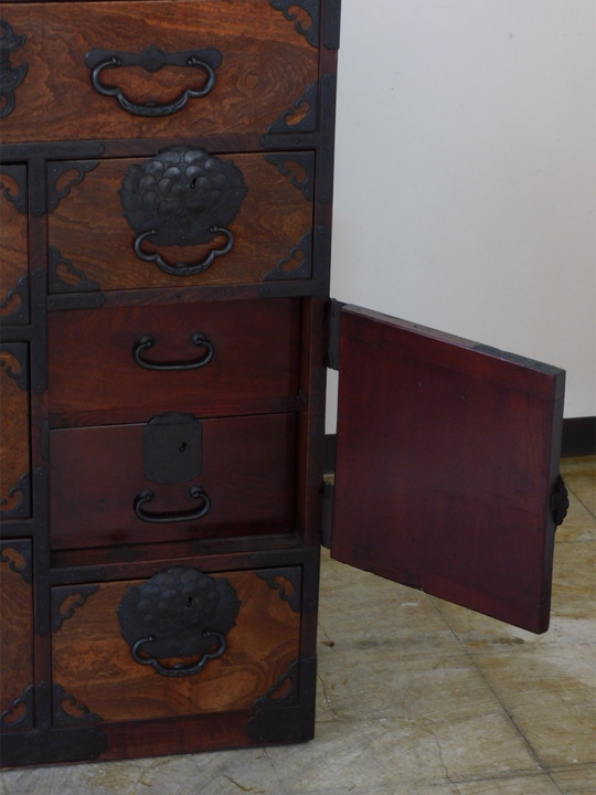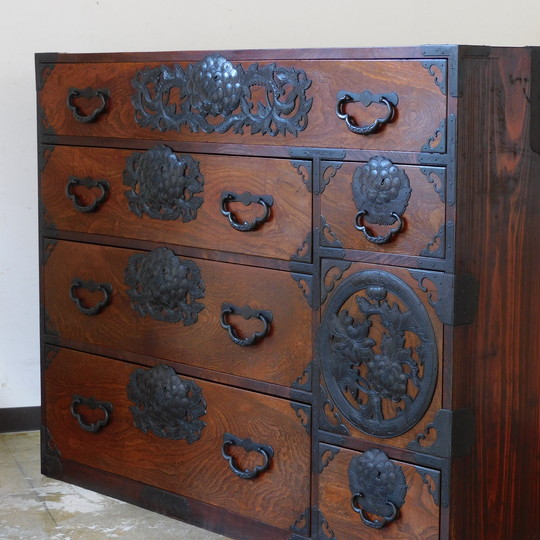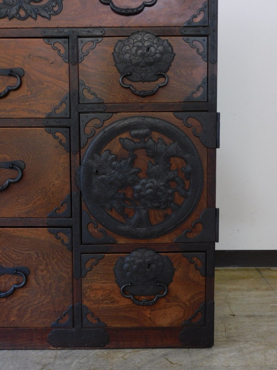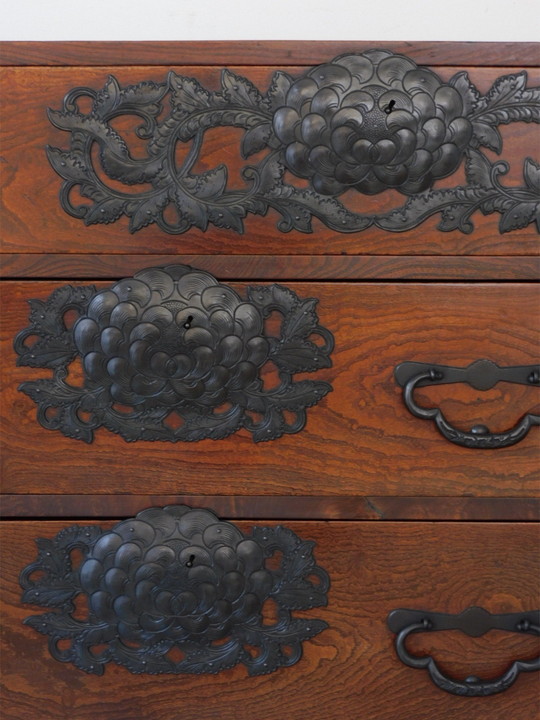 欅乱れ杢 共縁 仙台地方 牡丹図金具 時代箪笥 仙台箪笥 鍵付き HK-a-05440