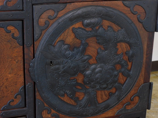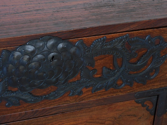 金具は躍動感のある牡丹の図案。打ち出しと鏨により見事に表現。引手にも重厚な木瓜引手。