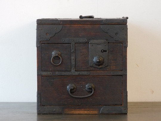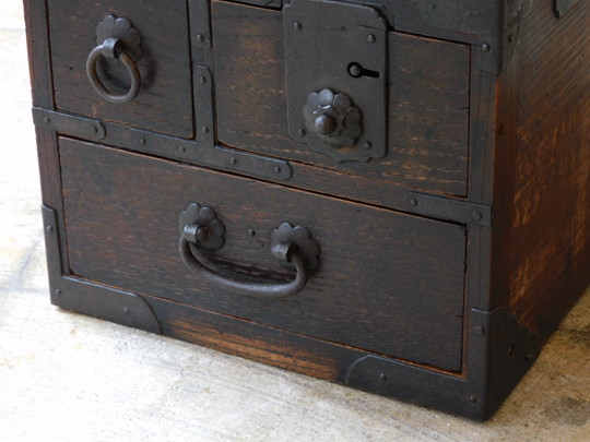 素材は艶のある栗の無垢材、引き出し内部ほか内部構造は杉の無垢材にて造られております。