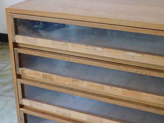 引き出しの稼働はスムーズ、全面にガラスが嵌っておりますので魅せながらの収納も可能。