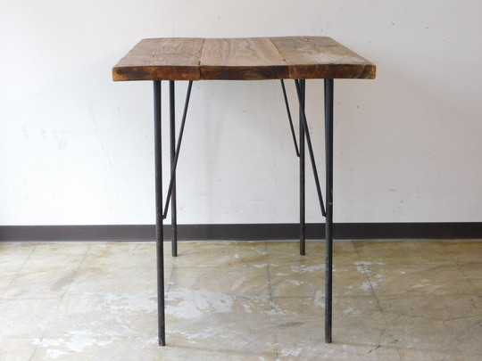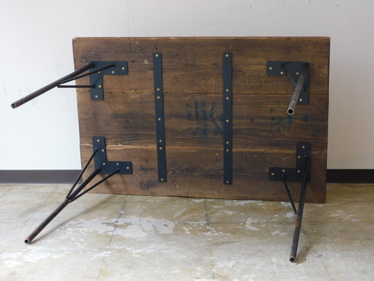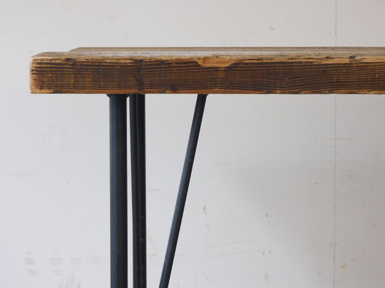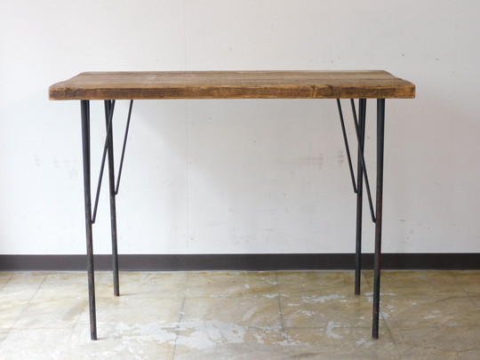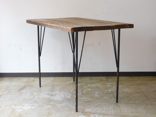 シャビーな雰囲気の鉄脚におあつらえ向きの枯れた木味の広い天板。